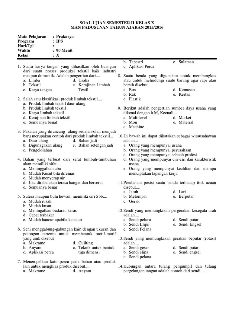 Soal uas prakarya dan kewirausahaan sma smk kelas x xi xii semester 1 2017 2018 ini merupakan soal terbaru yang akan saya bagikan untuk .